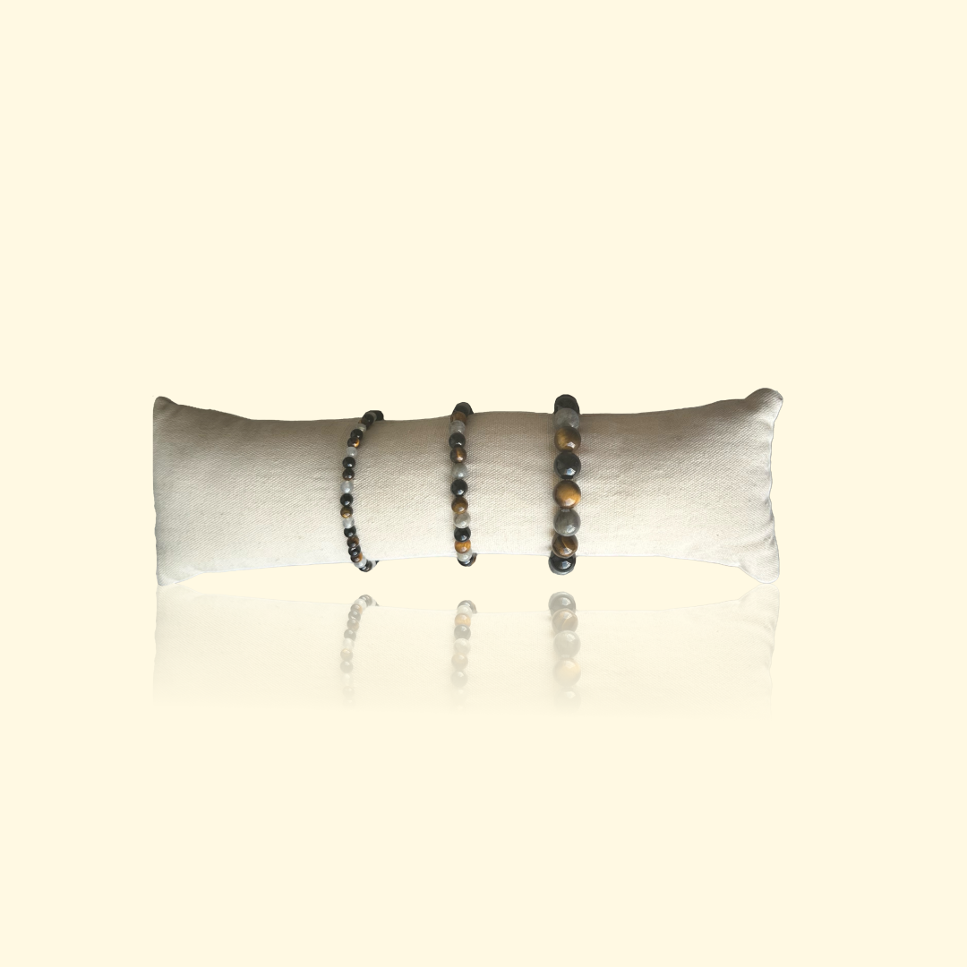 Ce bracelet associe la labradorite (reflets irisés protecteurs), l’obsidienne noire (verre volcanique d’ancrage) et l’œil de tigre (quartz chatoyant de confiance). Le contraste gris fumé irisé / noir profond / doré soyeux signe une pièce élégante, équilibrée et expressive.