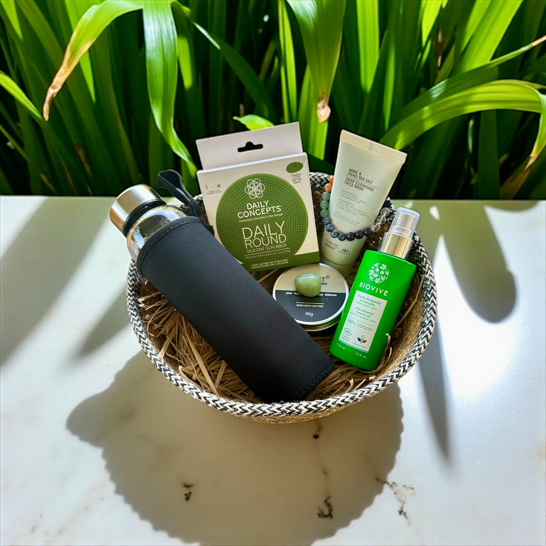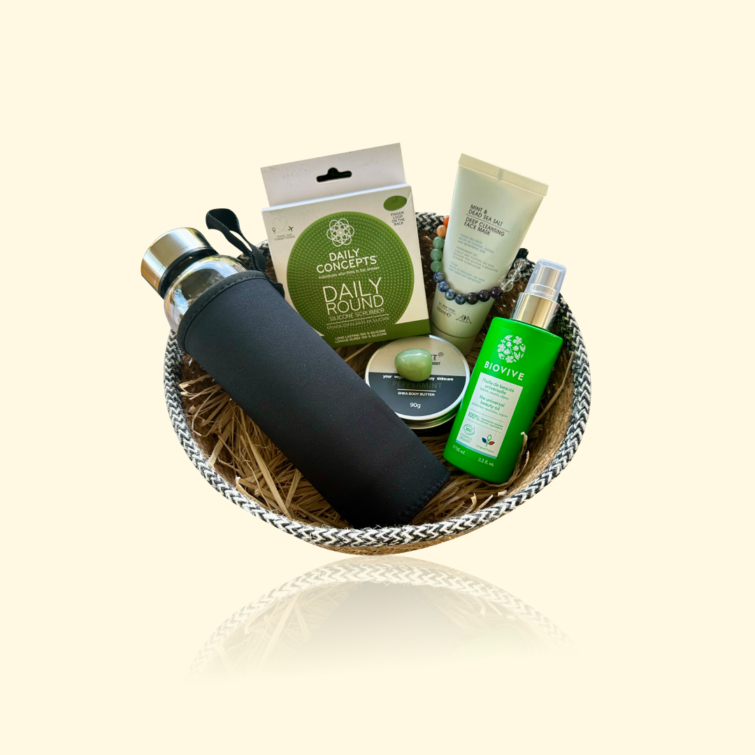 Coffret ÉLISE - fraîcheur menthe, éclat du visage & harmonie 7 Chakras. Ensemble prêt à offrir : bouteille TADASANA (compartiment pierre décoratif), masque visage Mint & Dead Sea Salt (pureté tonique), bracelet 7 Chakras 8 mm (montage élastique, féminin), beurre corporel Peppermint 90 g (karité nourrissant à effet frais), éponge de gommage visage Daily Concepts (exfoliation douce & hygiénique) et huile de beauté universelle BIOVIVE 95 ml (visage/corps/pointes, satin sans film gras), + pierres Améthyste & Jade (touches symboliques de sérénité & harmonie). Routine clean & sensorielle : exfolier, purifier, hydrater et nourrir, avec une signature mentholée rafraîchissante et une intention positive au poignet.
