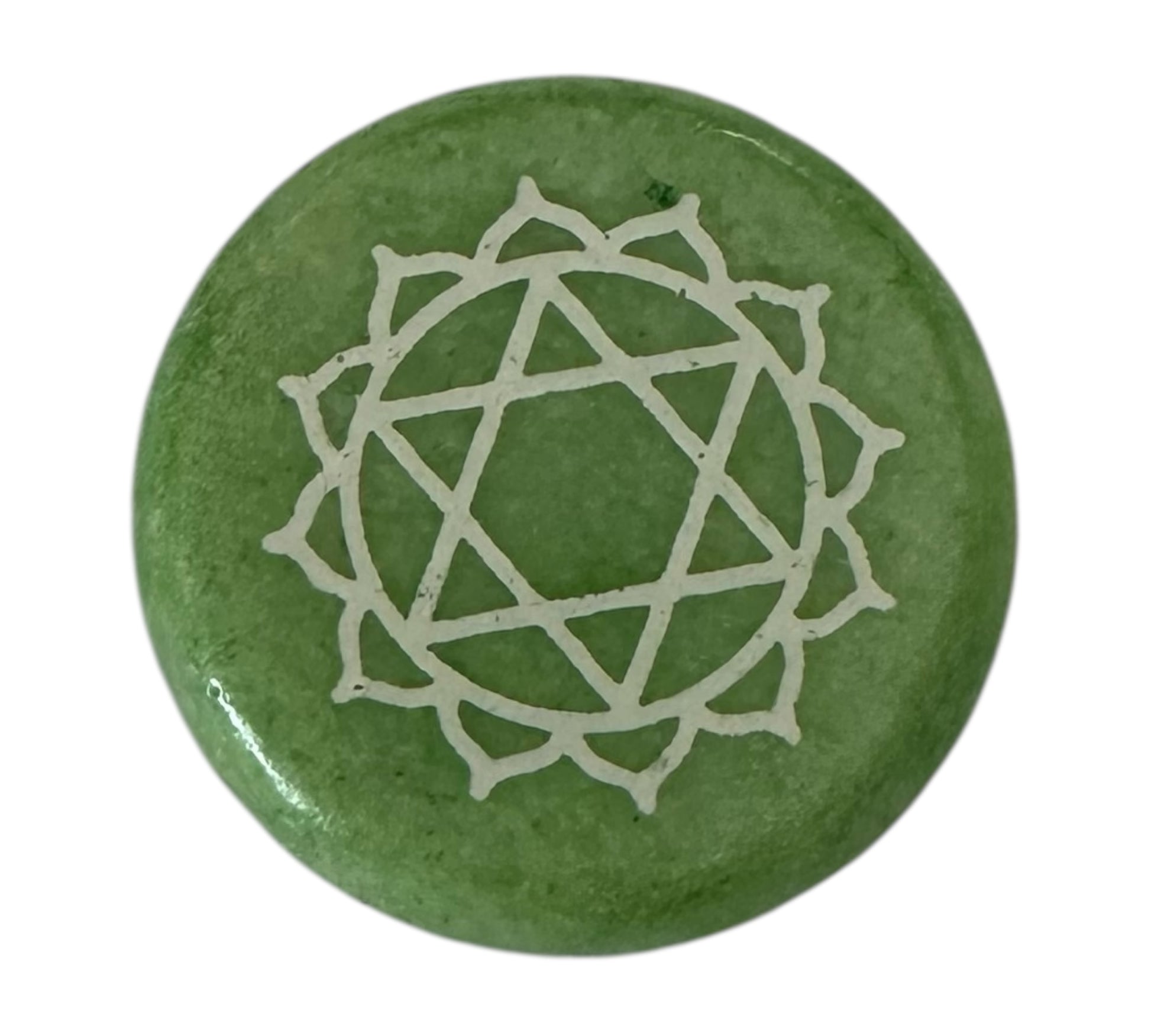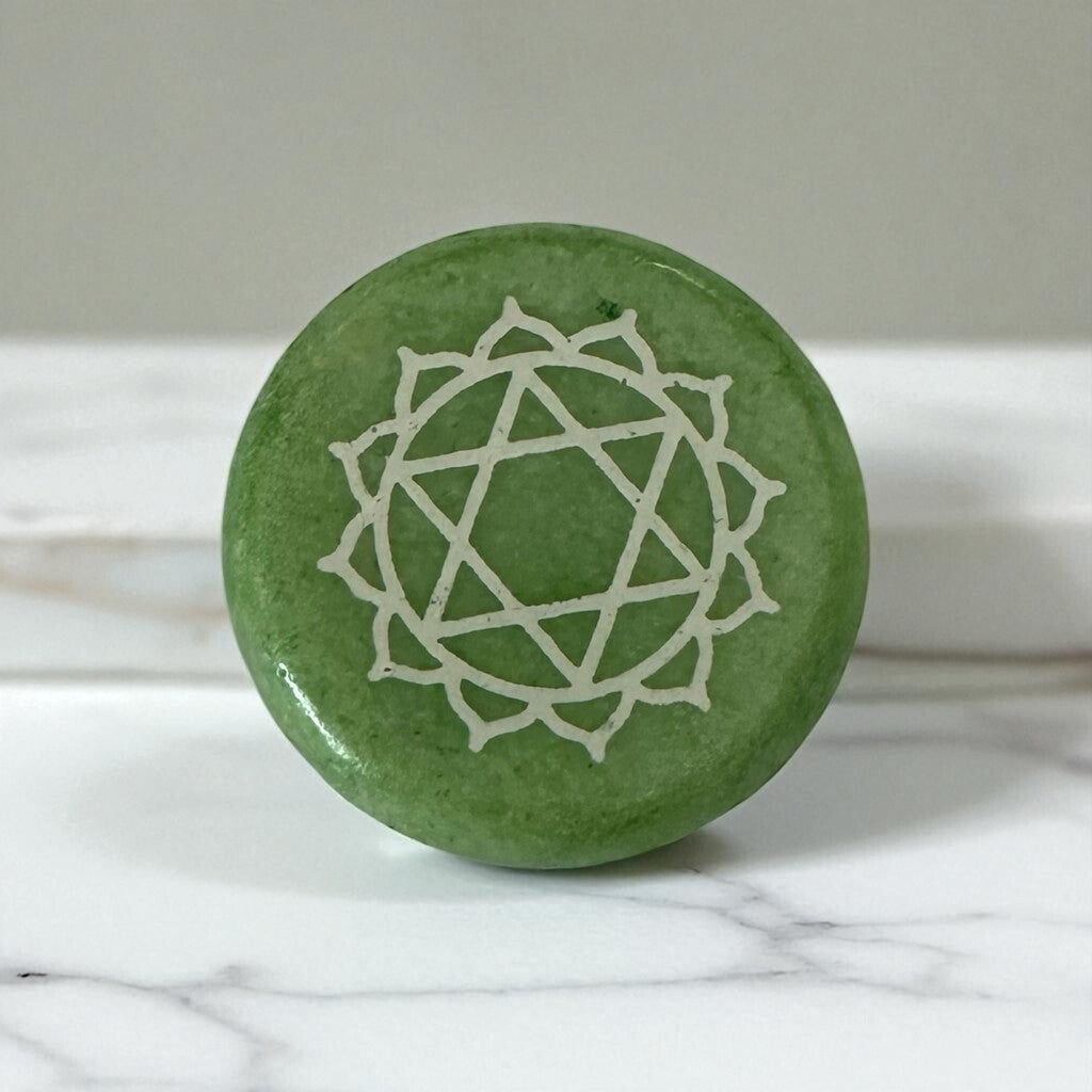 Selon le modèle : aventurine verte, jade ou pierre naturelle associée au Chakra du Cœur.