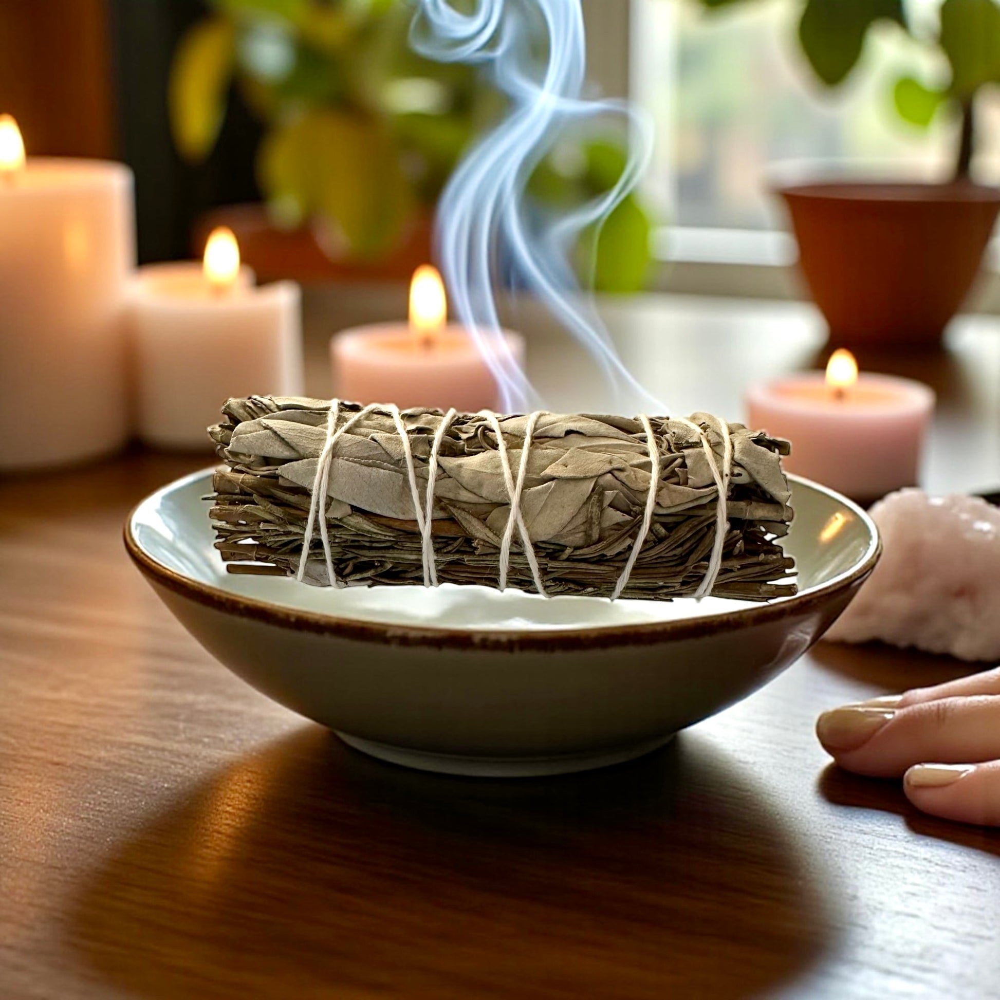 La sauge blanche, sacrée chez les peuples amérindiens, purifie les lieux, chasse les énergies stagnantes et restaure l’équilibre. Le romarin, plante solaire et protectrice, apporte clarté mentale, vitalité et ancrage.