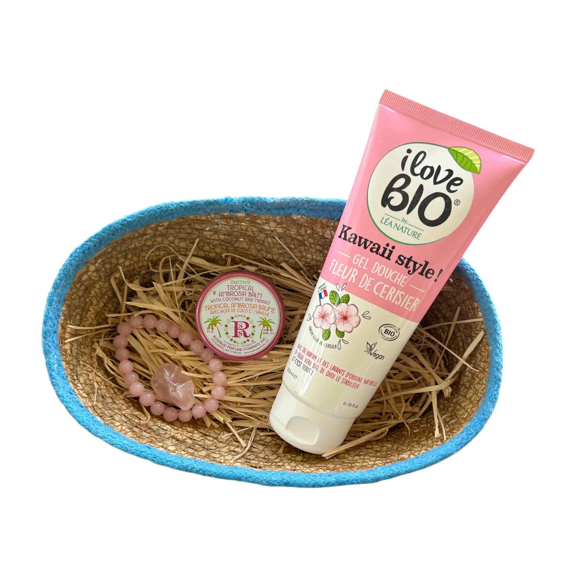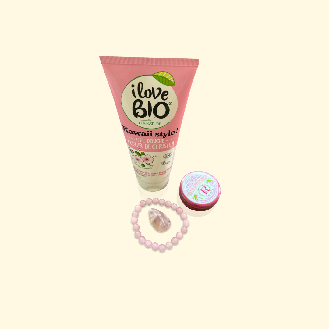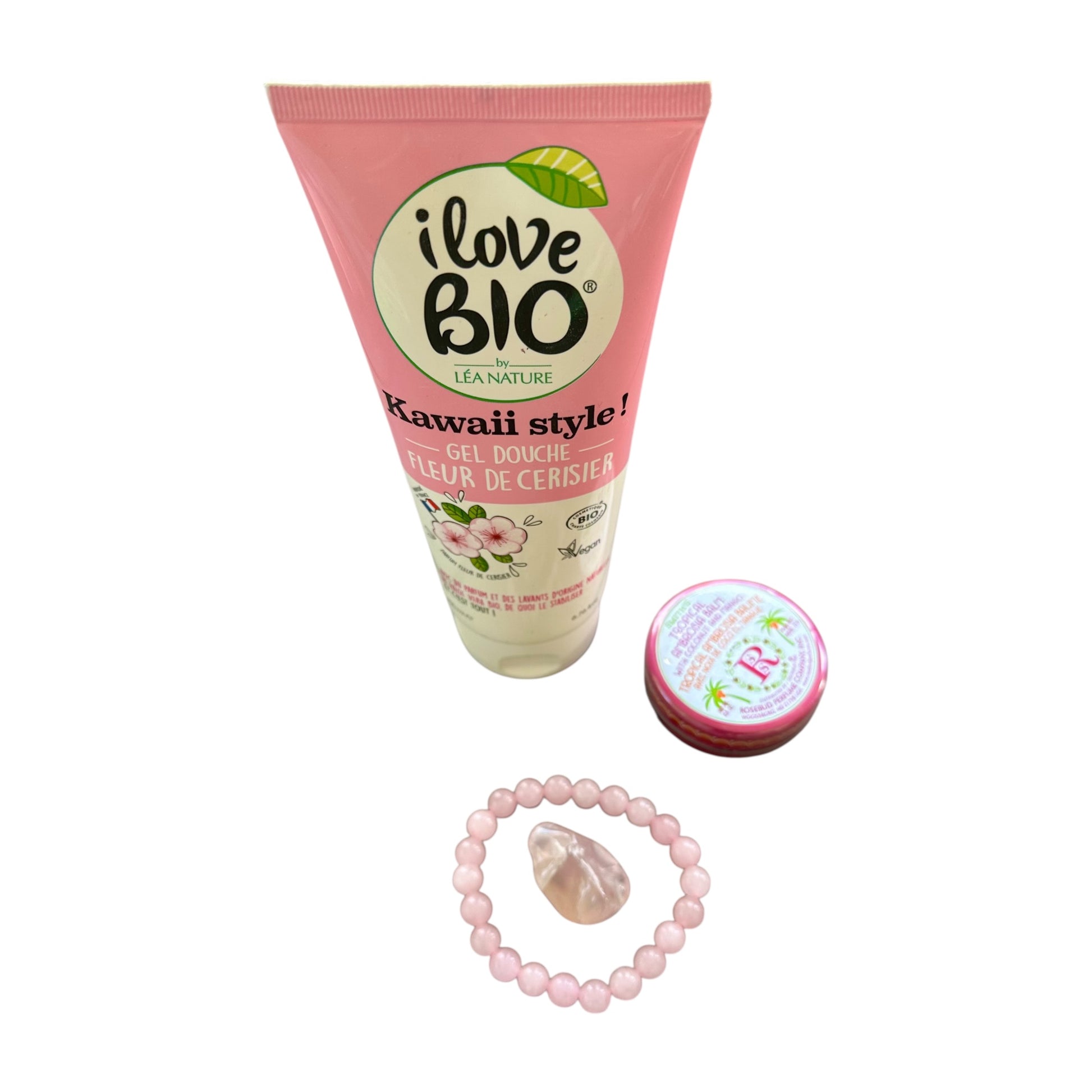 Coffret CATERINA - fleur de cerisier & douceur quartz rose. Ensemble prêt à offrir : gel douche Fleur de cerisier I Love Bio (mousse fine, parfum floral “peau propre”), baume lèvres SMITH’S coco & mangue (nutrition gourmande, fini doux), bracelet Quartz rose 8 mm (montage élastique, féminin) + pierre roulée Quartz rose (intention tendresse). Routine express & sensorielle : nettoyer en douceur, hydrater les lèvres toute la journée et porter une énergie d’amour de soi.