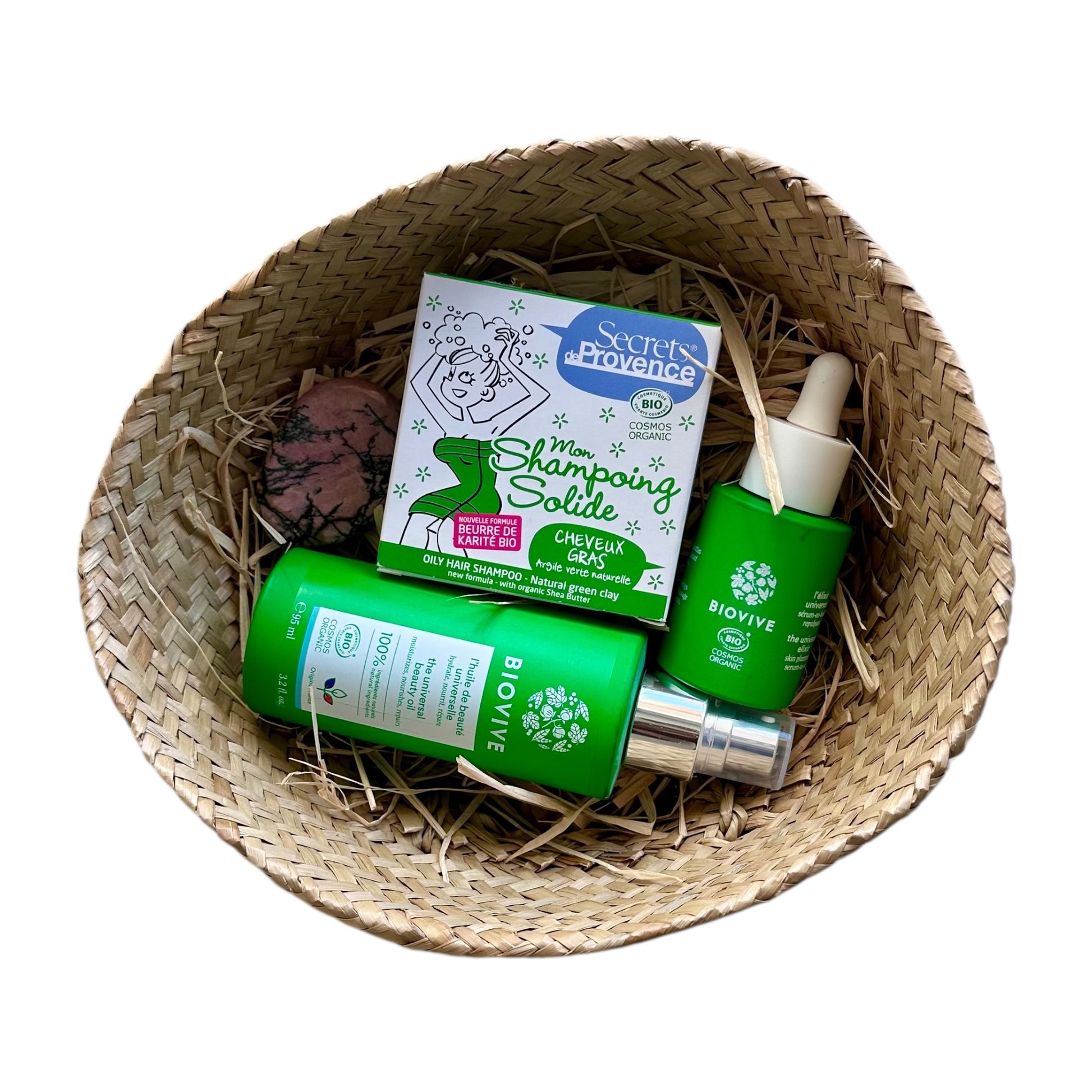 Le Coffret MALIKA réunit 3 essentiels beauté - BIOVIVE (huile + élixir) et shampoing solide cheveux gras - complétés par un galet de Rhodonite. Un rituel simple, sensoriel et efficace, prêt à offrir.