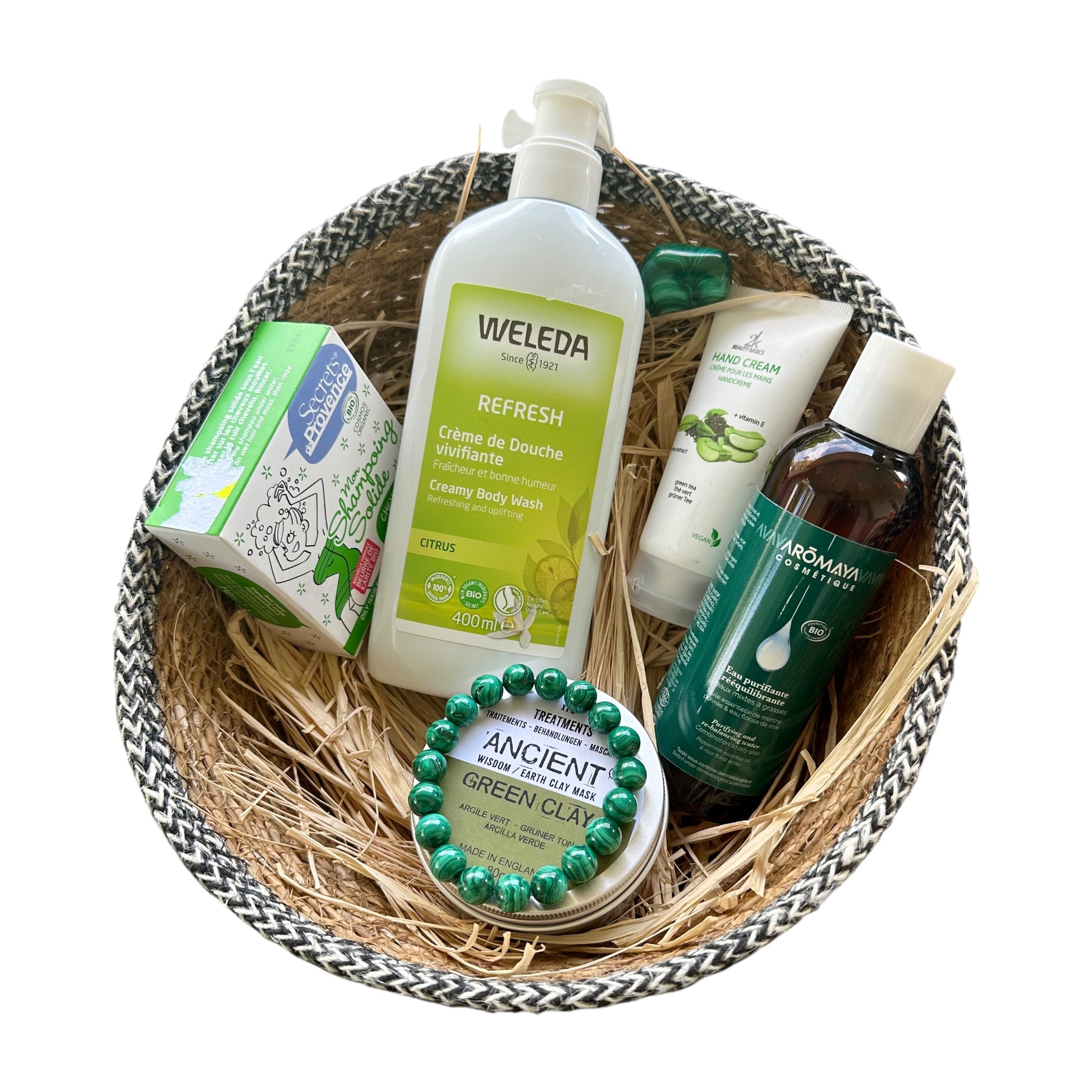 Objectif routine : purifier & rééquilibrer (eau AROMAYA + argile verte), vivifier sous la douche (WELEDA), soigner les mains, assainir la chevelure (shampoing solide) et ancrer une intention de protection (Malachite).