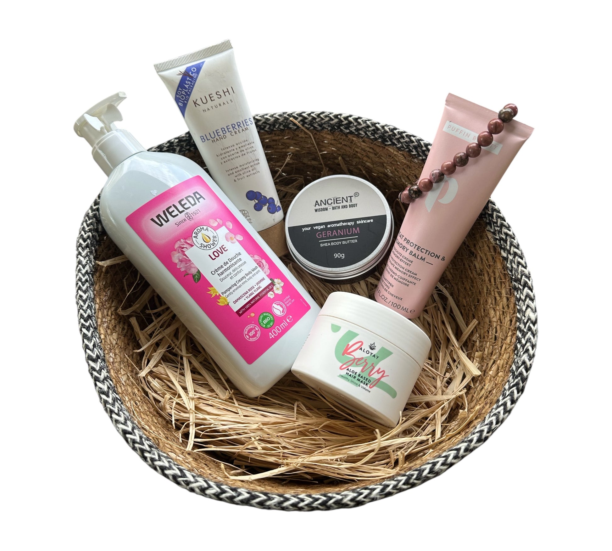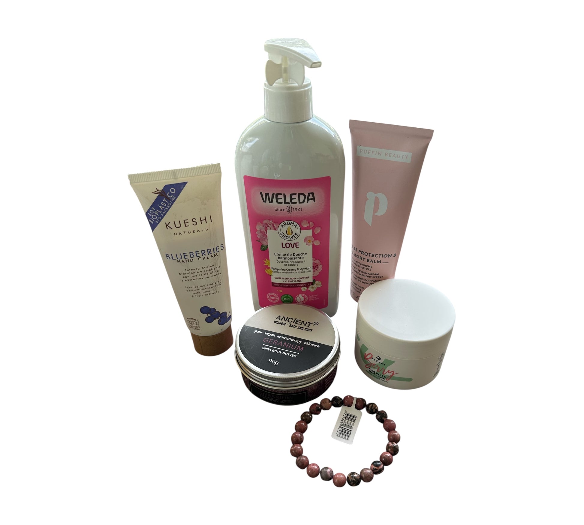 Un kit prêt-à-offrir qui réunit 5 essentiels grand format (crème coiffante mémoire PUFFIN BEAUTY 100 ml, beurre corporel géranium ANCIENT WISDOM 90 g, crème mains BLUEBERRIES, crème de douche WELEDA 400 ml, masque capillaire Aloyay Berry) et un bracelet en pierre naturelle de Rhodonite 8 mm (montage élastique, femme). Il nettoie, nourrit, répare et discipline les cheveux tout en choyant la peau, puis ancre une intention de douceur & équilibre. Textures fondantes, fini non collant, tenue souple sans “carton”, sillage floral propre. Idée cadeau raffinée, pratique au quotidien.