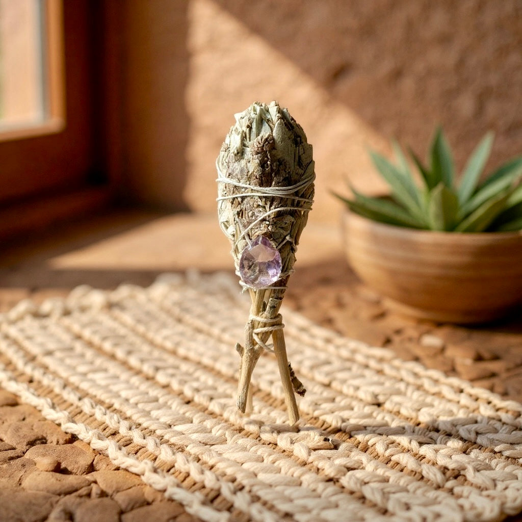 Élevez vos énergies et illuminez votre espace avec le Fagot de Sauge Blanche & Cristal de Roche.