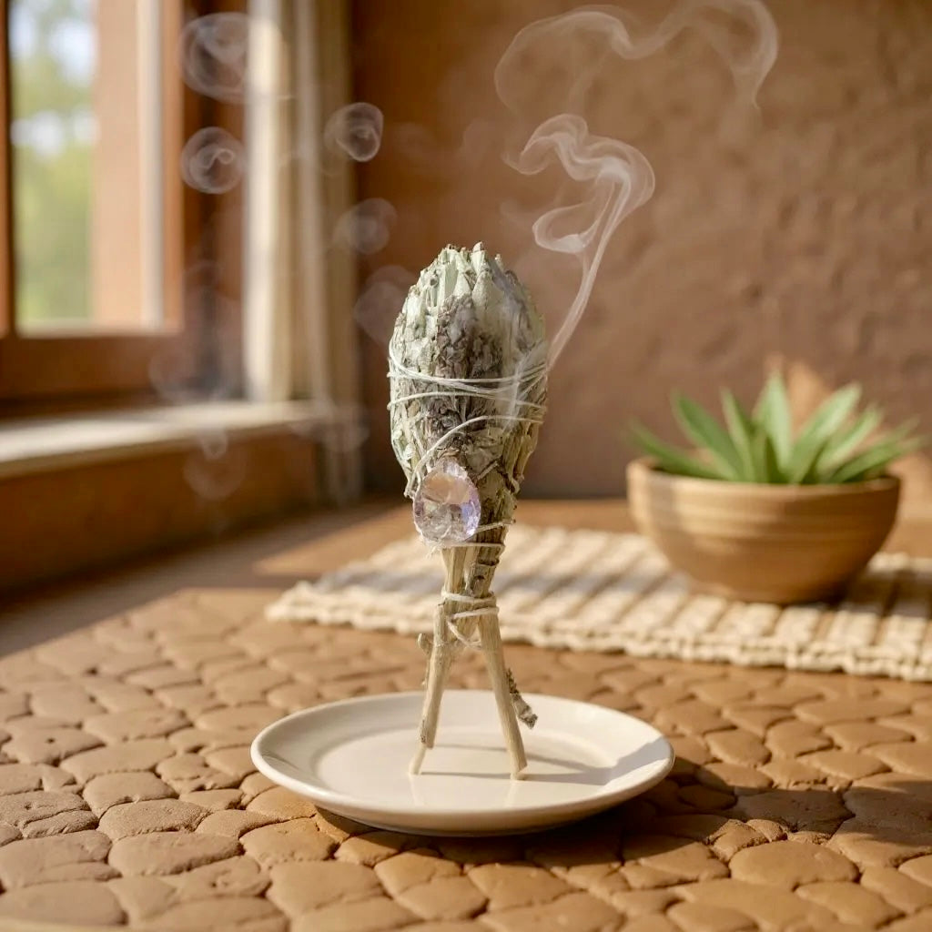 La sauge, plante sacrée des traditions amérindiennes, nettoie et purifie les énergies stagnantes, tandis que le cristal de roche, pierre d’harmonie universelle, amplifie les vibrations positives et favorise la clarté mentale. Ensemble, ils créent un rituel énergétique complet, unissant purification, recentrage et élévation spirituelle.